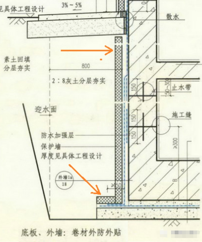 ↘↘基礎外挑部分側邊砌筑保護墻,卷材防水采用外防內貼法;基礎以上砌體采用外防外貼法,如下圖所示。