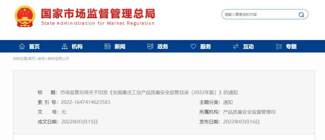 3月16日,國家市場監(jiān)管總局發(fā)布了《全國重點工業(yè)產(chǎn)品質(zhì)量安全監(jiān)管目錄(2022年版)》,此監(jiān)管目錄旨在進(jìn)一步加強工業(yè)產(chǎn)品質(zhì)量安全監(jiān)管,據(jù)悉,整治年針對重點工業(yè)產(chǎn)品等,在生產(chǎn)和流通領(lǐng)域開展產(chǎn)品質(zhì)量監(jiān)督抽查工作。